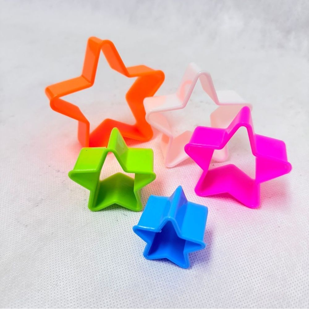 Jogo de Cortadores de plástico no formato de Estrelas, ideais para auxiliar na decoração de bolos em Pasta Americana, preparação de biscoitos, mono porções, trabalhos artesanais (biscuits) e entre outros. Utensílio utilizado em Cozinhas domésticas, Panificadoras e Confeitarias.
